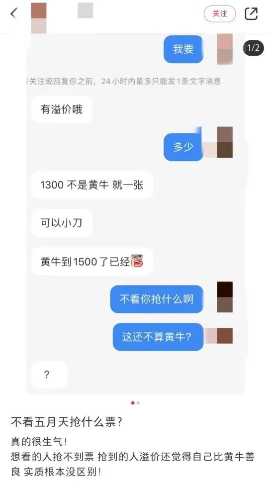 **另外,演出市場經過三年的沉寂,導致今年演唱會積壓了大量的需求,許多路人也湧入參與搶票。**這其中也出現了很多倒賣為目的的“黃牛行為”,將搶到的票通過溢價之後在第三方平台轉售,旺盛的需求導致溢價一路高漲,也引發了粉絲對黃牛的大規模抵制,表示“寧可鳥巢門口站,也不能讓黃牛賺。”