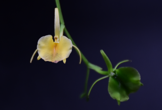 鐮翅羊耳蒜(L. bootanensis)全株及花細部圖,下圖展示了的具鐮刀狀翅的合蕊柱(張中揚 攝)