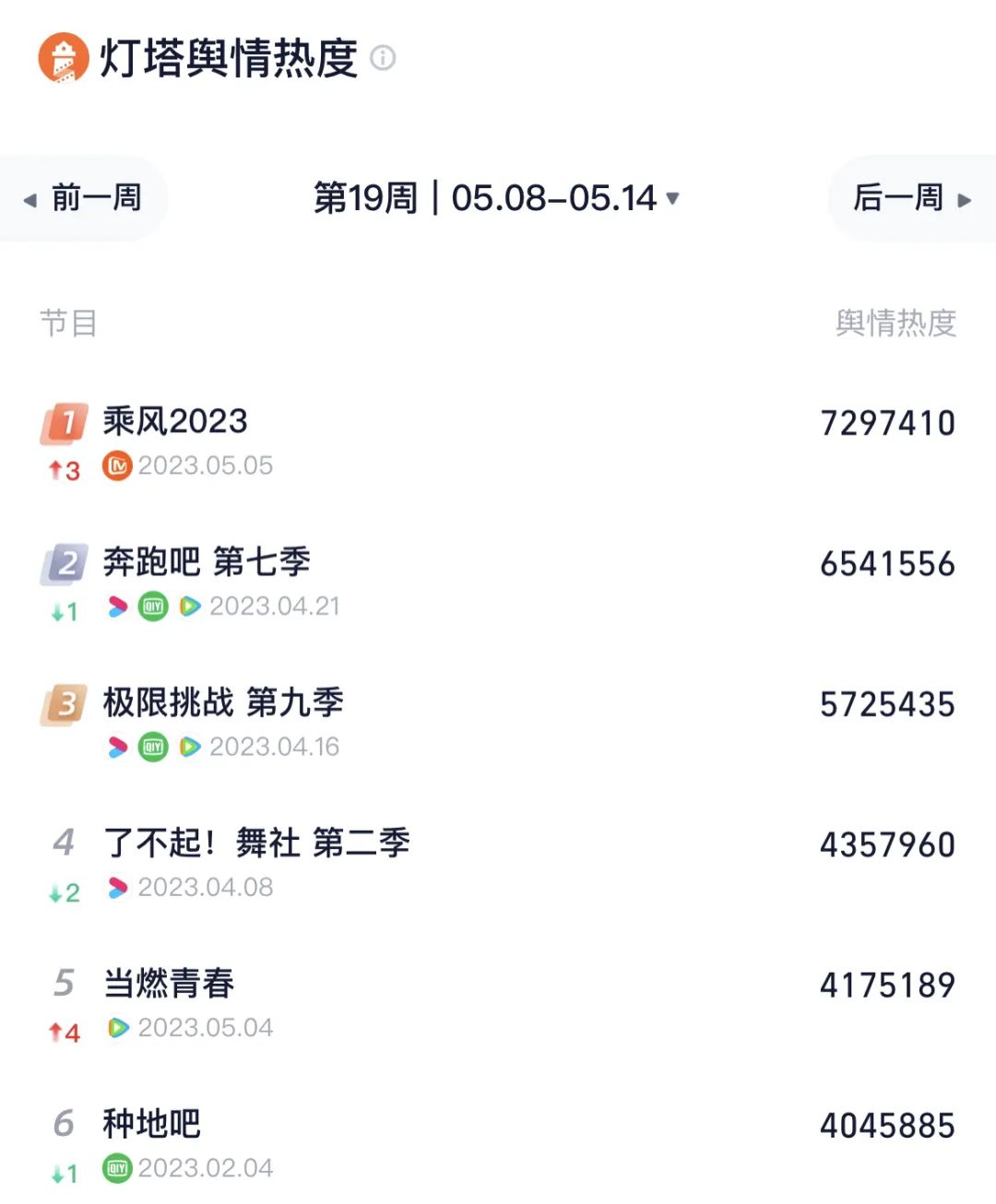 觀眾仍然熱愛討論這檔綜藝:燈塔專業版顯示,《乘風2023》(以下簡稱“浪姐4”)登頂上週輿情熱度周榜,大大小小的熱搜話題覆蓋了龔琳娜美依禮芽的《花海》舞台、徐懷鈺划水以及謝娜組票數爭議,甚至你能在熱搜上看到完整的故事線,從發生再到投票觀眾的解釋,都可以登上熱搜。