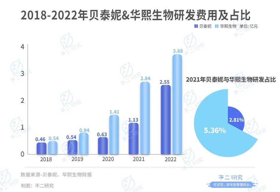 反觀華熙生物,2018年-2022年研發費用分別為0.53億元、0.94億元、1.41億元、2.84億元和3.88億元,佔營收比重分別為4.20%、4.98%、5.36%、5.74%和6.10%,均高於貝泰妮的投入水平,其中2021年華熙生物的研發投入是貝泰妮的兩倍有餘。