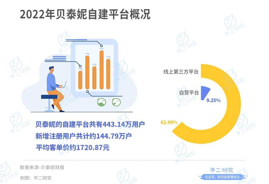 截至2022年年底,貝泰妮的自建平台共有443.14萬用户,新增註冊用户共計約144.79萬户;平均客單價約1720.87元。年報顯示,在線上渠道收入中,自營平台的銷售佔比已達到9.25%;通過線上第三方平台的銷售佔比為62.99%。