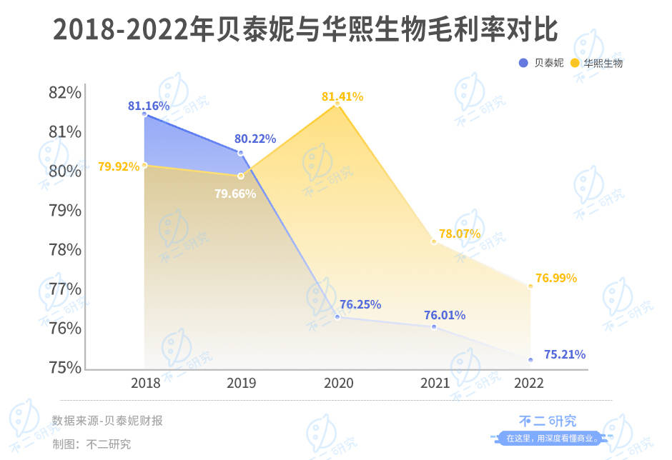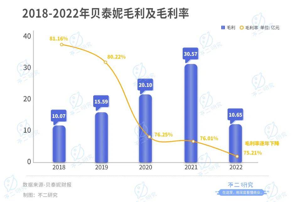 但業績向好背後,亦暗藏頹勢。年報顯示,2018年-2022年,貝泰妮毛利潤分別為10.07億元、15.59億元、20.10億元、30.57億元、10.65億元;毛利率分別為81.16%、80.22%、76.25%、76.01%、75.21%,儘管一直維持較高水平,但卻呈現逐年下降的趨勢。