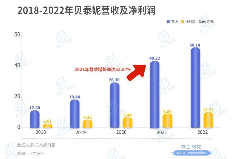 年報數據顯示,2018年-2022年,貝泰妮營收分別為12.40億元、19.44億元、26.36億元、40.22億元、50.14億元,其中2021年增長率達52.57%;淨利潤分別為2.61億元、4.12億元、5.44億元、8.63億元、10.51億元,其中2021年增長率高達58.77%。