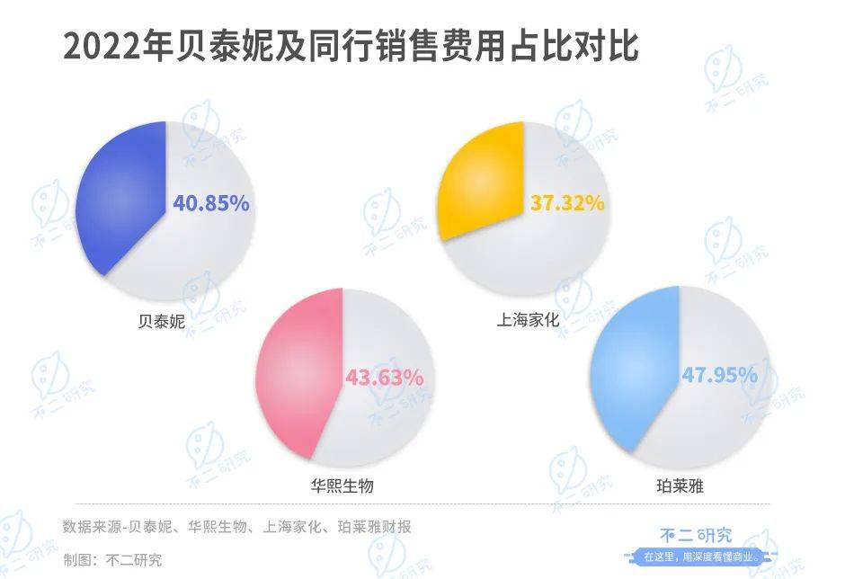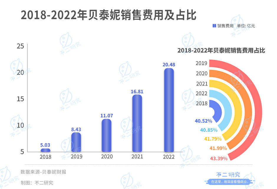 財報顯示,貝泰妮銷售費用率常年高於40%。2018年-2022年,貝泰妮銷售費用分別為5.03億元、8.43億元、11.07億元、16.81億元和20.48億元,均高於淨利潤水平;銷售費用佔營收比重分別為40.52%、43.39%、41.99%、41.79%和40.85%。