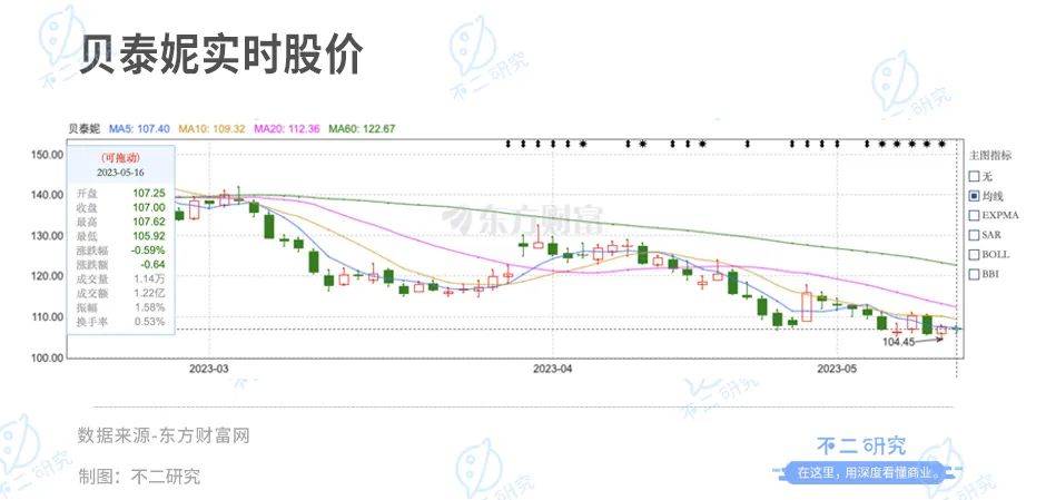 3月30日,貝泰妮年報公佈後的首個交易日,其股價上漲5.61%。截止5月16日收盤,貝泰妮股價報107.00元/股,對應市值453.3億元。對比2021年的市值高點,貝泰妮當前股價已近乎腰斬,市值蒸發超700億元。
