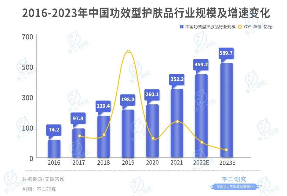 歐睿國際顯示,2022年我國皮膚學級護膚品(功能性護膚)市場規模達到285.9億元,同比增長6.8%。根據艾瑞諮詢,未來三年功能型護膚市場規模將以29.4%的年均複合增速繼續增高,並於2023年達到589.7億元。