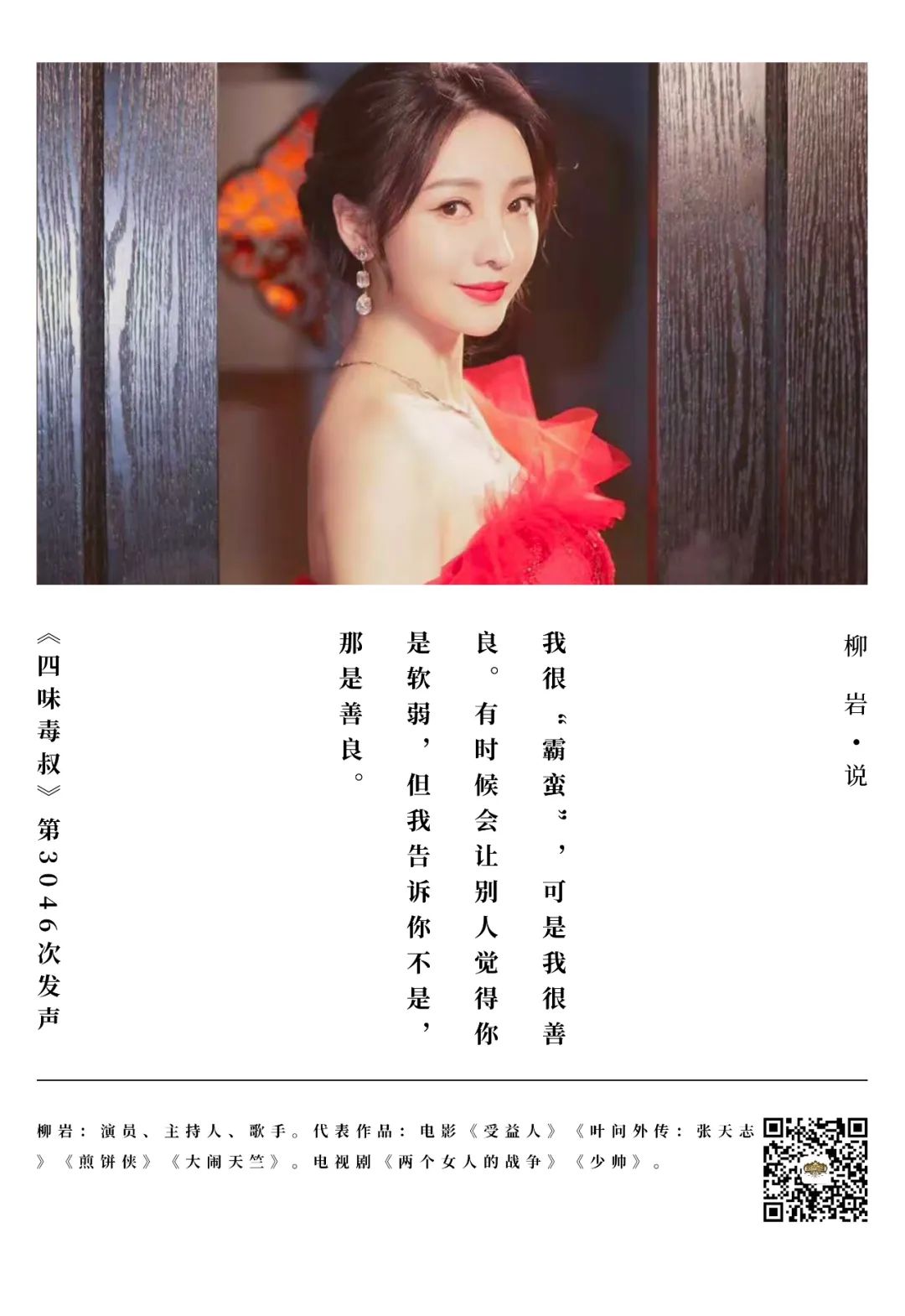 **柳巖:**我很“霸蠻”,可是我很善良。有時候會讓別人覺得你是軟弱,但我告訴你不是,那是善良。有的時候我選擇不説,或者我不去攻擊你,並不是代表我軟弱,是因為我覺得做人還是要有基本的善良和底線。但可能對方並不知道,我自己知道。我覺得人要對自己很多的行為負責,要忠於自己的良心,這是我在這個行業裏一直秉承的一個基本標準。