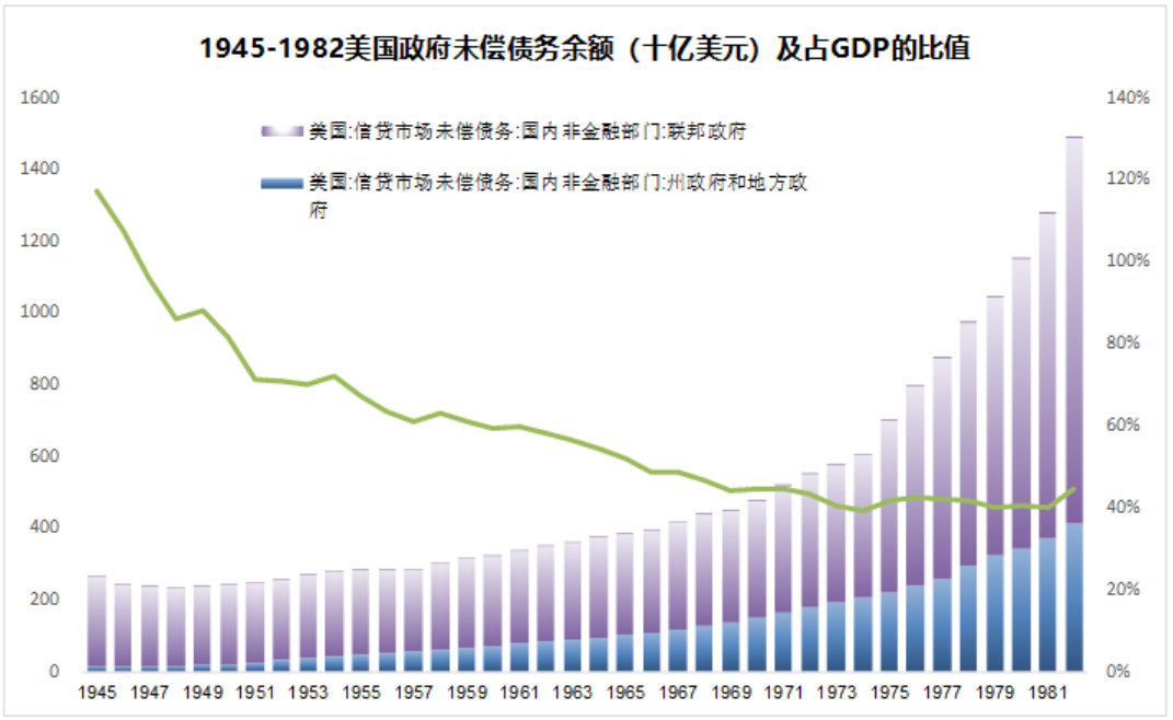 美國政府總體的債務情況,在那段時間是相當剋制的。從1945年開始,美國政府的債務確實是逐年上升的,但GDP上升的更快,所以未償債務佔GDP的比值反而是逐年下降的。