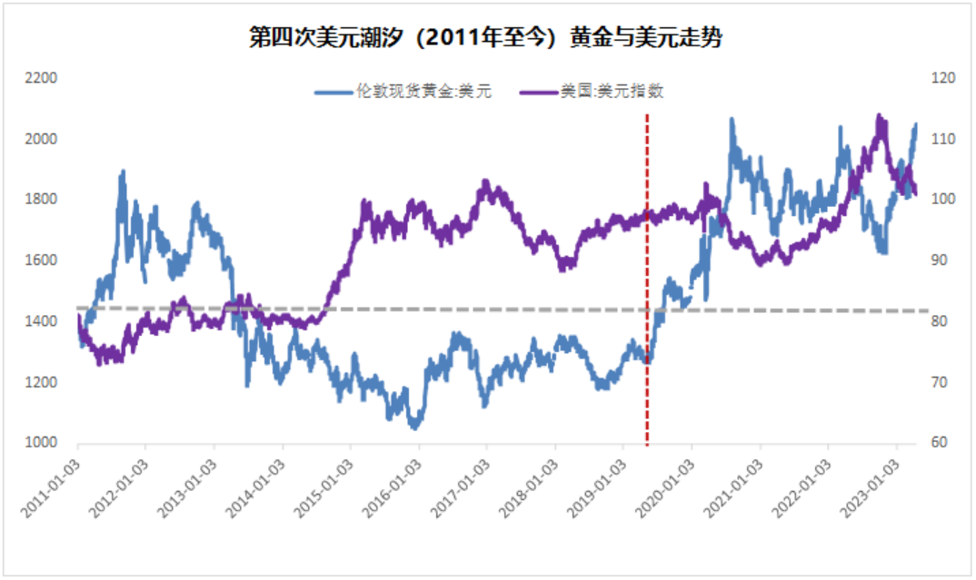從1981年開始一直到2010年前三次美元潮汐中,黃金價格大體上與美元指數走勢是負相關的。但是第四次美元潮汐中,情況發生了變化。