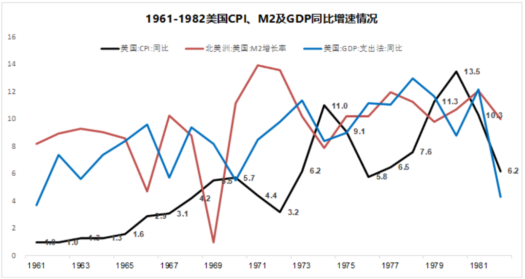 黃金的另一頭對應的美元在二戰後卻越發越多。從1961年開始到1982年的大多數年份,美國M2的增速都在8%以上,與此同時CPI也逐漸抬頭,也就是説,美元在美國的購買力也越來越虛。