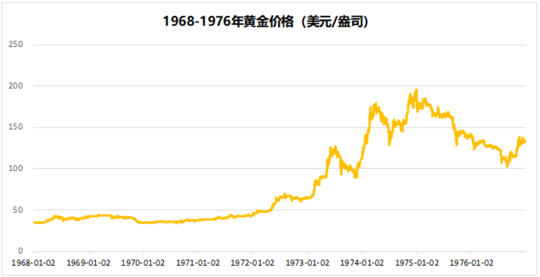 在尼克松宣佈暫停美元兑換黃金的1971年之後,世界進入牙買加體系時代,黃金被踢出了貨幣行列,各國之間匯率的依據都是各自法定貨幣的內在價值。黃金不再作為結算的工具,但還保留了財富貯藏的功能。佈雷頓森林體系結束的1971年,黃金價格還維持在50美元每盎司之下,從1972年開始,黃金走出了持續3年的牛市行情,最高接近200美元每盎司。