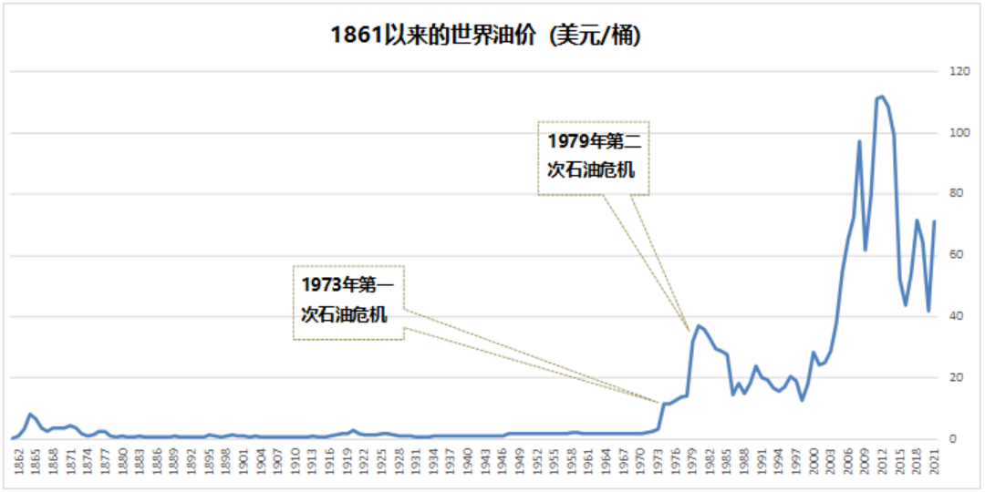 從1861年到1970這110年中,大部分年份石油的價格每桶都不到2美元,極其的穩定。1973年10月,第四次中東戰爭爆發,石油輸出國組織也就是歐佩克對以色列以及支持以色列的國家實施石油禁運,石油價格輕輕鬆鬆的就漲到了最高13美元一桶,這是第一次石油危機。1979年第二次石油危機爆發,石油價格從15美元每桶最高漲到了39美元。