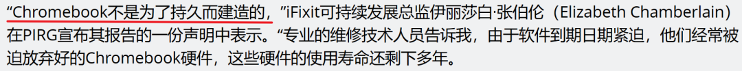 知名拆解和維修網站 iFixit 在一份報告裏甚至直説了,**Chromebook 就不是為了持久使用而造的,**就算硬件壽命還有好幾年,緊迫的 AUE 日期也會讓用户拋棄掉電腦。