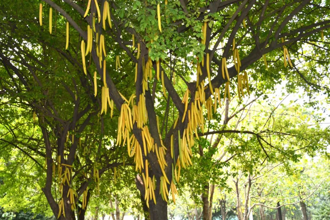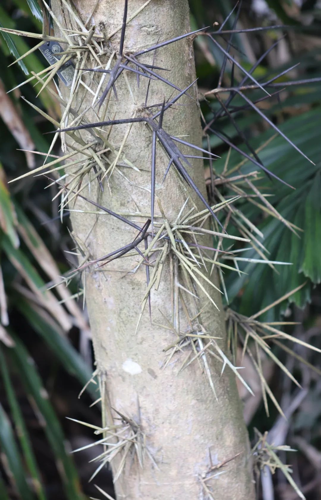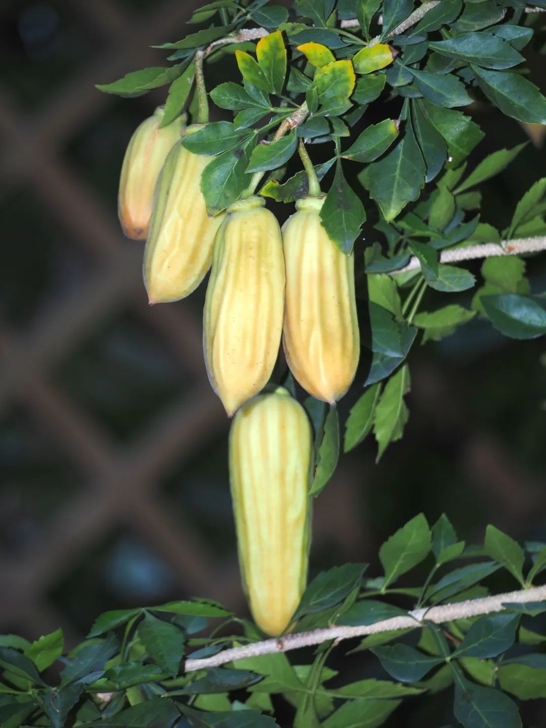 食用蠟燭樹(Parmentiera aculeata)為紫葳科蠟燭樹屬植物,其屬名Parmentiera是為了紀念法國科學家 A. A. Parmentier (1737-1813)而命名,種加詞aculeata意思為有刺的。食用蠟燭樹枝上有刺,刺不算大,沒留意還挺難發現,看上去蠻温柔,試一試就知道厲害了。記得我第一次看到食用蠟燭樹開花,刨開葉子拍花,突然疼痛襲來……好好的長刺干嘛?食用蠟燭樹為灌木或小喬木,不算高,大約7-10米,從樹的基部到樹頂一路分枝,樹基部的小枝也會開花結果,果還能吃。大抵是因為自身防禦,演化出了刺,人們也利用食用蠟燭樹有刺的特點,將它用作牲畜養殖的圍欄。許多植物都有刺,比如廣州市花——木棉(Bombax ceiba)、美麗異木棉(Ceiba speciosa)、皂莢(Gleditsia sinensis)等,以前人們用皂莢的果代洗衣粉使用,比起食用蠟燭樹的刺,皂莢的刺生猛多了。