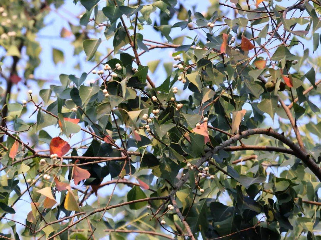 説了原產熱帶美洲的蠟燭樹們,你是否也好奇中國有沒有蠟燭樹?還真有,最家喻户曉的就是烏桕(Triadica sebifera)。烏桕為大戟科烏桕屬高大喬木,為我國著名的鄉土樹種。“日暮伯勞飛,風吹烏桕樹。”南北朝時的樂府民歌中就有記載,烏桕在我國有大約1500年的栽培歷史。它菱形葉片帶着小尾尖,還有特別的“白色”種子,辨識度非常高。白色的蠟質層為假種皮,這些富含高熱量油脂的蠟質是許多鳥類喜歡的食物,《本草綱目》有記載烏桕“以烏喜食而得名”。白色蠟質溶解後可用作肥皂和蠟燭原料,故又稱Chinese tallow tree(中國蠟樹)。
