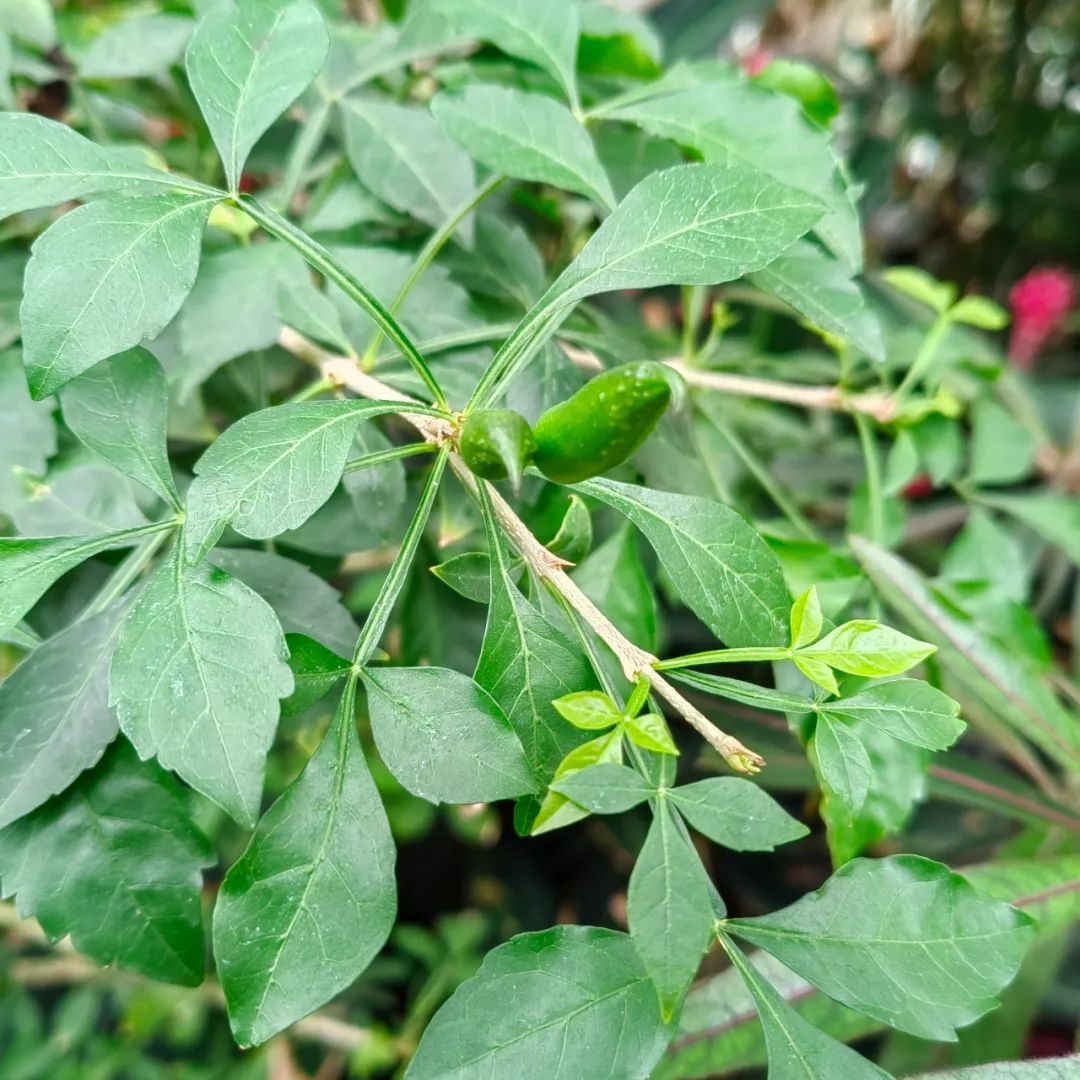 蠟燭樹和食用蠟燭樹不僅可以觀花、觀果,葉子也非常有趣,葉片通常十字形狀,葉端比側葉大,總柄上有翅。紫葳科中十字形葉的植物還不少,除了它們外,還有叉葉木(Crescentia alata),叉葉木葉柄的翅更闊大,食用蠟燭樹和蠟燭樹葉柄的翅狹長。那食用蠟燭樹和蠟燭樹怎麼分呢?單靠營養器官葉子來識別植物並不靠譜,所以植物分類上更多地依靠花、果等承擔繁衍重任的部位來鑑定植物。蠟燭樹老莖生花結果,細長的果像線椒,摸起來光滑,手感也酷似蠟燭;食用蠟燭樹果實圓柱形,較為粗短,肋縱向突出。除此之外,蠟燭樹沒有刺,食用蠟燭樹枝上有刺,這也是分辨兩姊妹的好辦法!