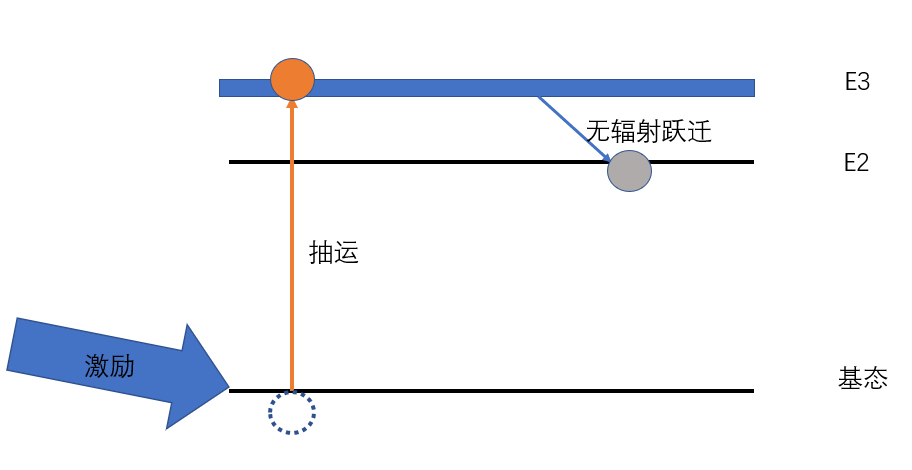 首先通過合適的激勵把基態粒子直接運上 E3 能級,而 E3 能級和 E2 能級之間存在無輻射躍遷過程,也就是 E3 上的粒子會很快通過碰撞跑到 E2 上,減少的能量變成熱運動能量,而不是發光。