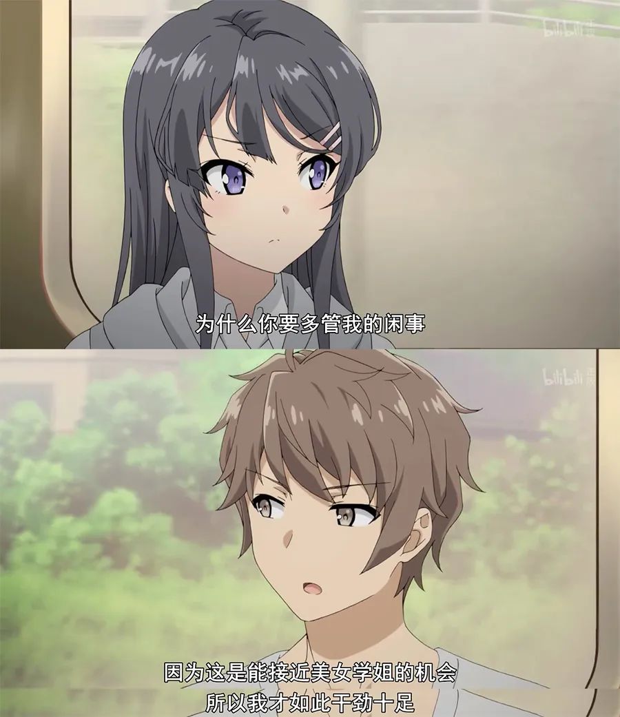 梓川咲太腦子裏好像也的確有不少有色廢料,但是從正常的眼光來看,他的態度並不狎暱,他的言行舉止並未給動畫人物尤其是女主造成任何冒犯。