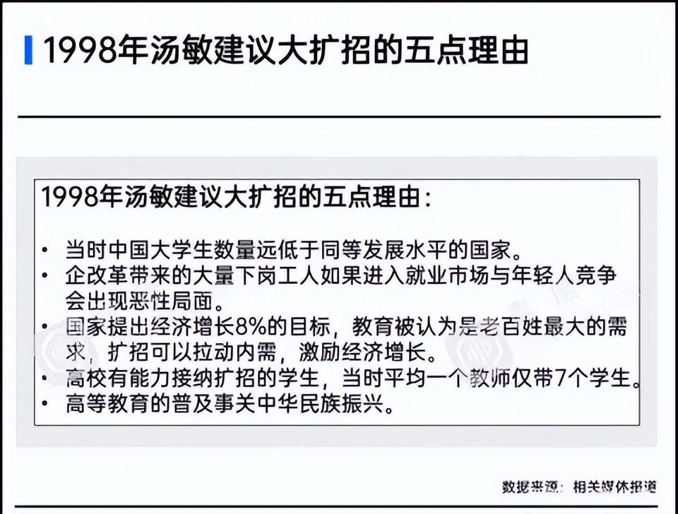 經濟學家湯敏以個人名義向中央提交了一份建議書:《關於啓動中國經濟有效途徑———擴大招生量一倍》,建議中央擴大招生數量。