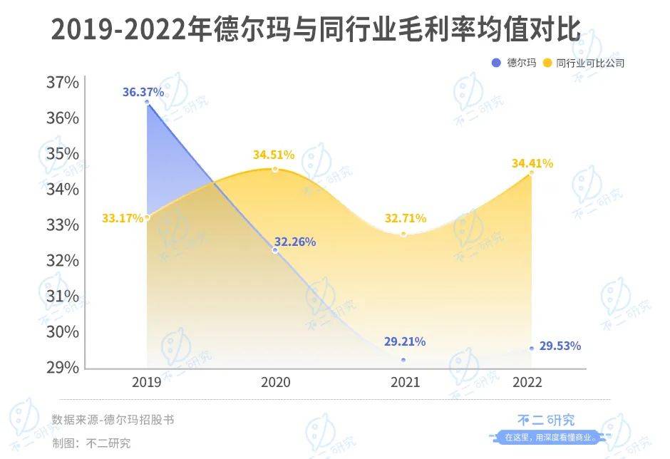 然而,「不二研究」認為,原材料漲價並非德爾瑪毛利率下降的主因。據其招股書顯示,2019年-2022年行業內可比公司毛利率均值分別為33.17%、34.51%、32.71%和34.41%,波動幅度並不大。若原材料漲價導致毛利率下降,影響的將是整個行業,但是整個行業的毛利率變化並沒有像德爾瑪一般呈明顯下降趨勢。