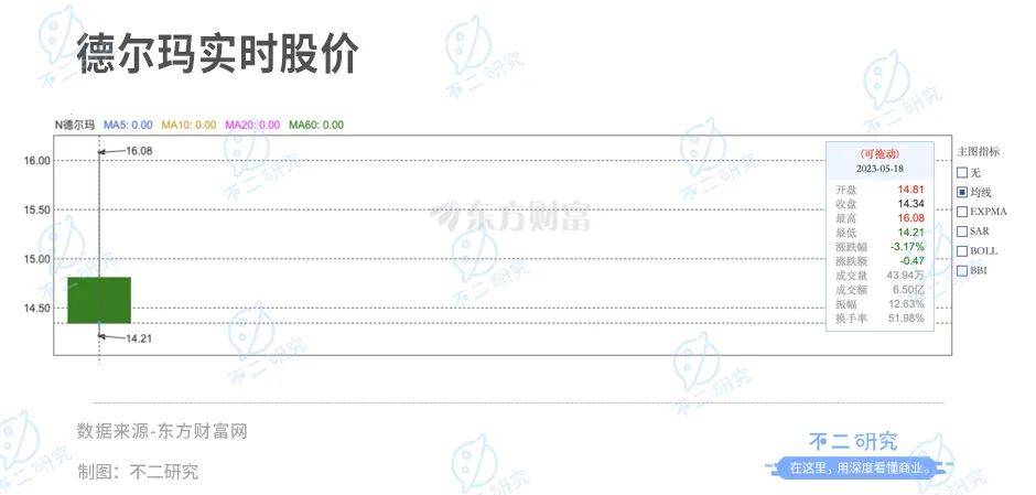 德爾瑪此次IPO募資淨額為12.31億元,開盤價為14.81元/股,與發行價持平;盤中一度破發。截至5月18日收盤,德爾瑪報收14.34元/股,對應市值66.19億元,較發行價下跌3.17%。