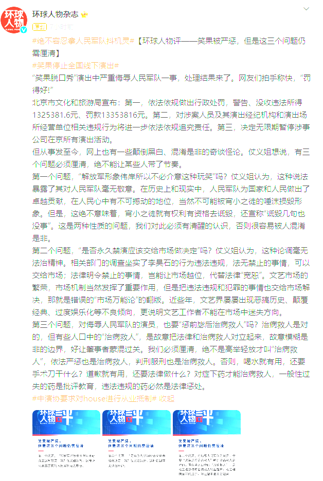 人民網旗下《環球人物》評論:笑果被嚴懲,但是這三個問題仍需釐清_風聞