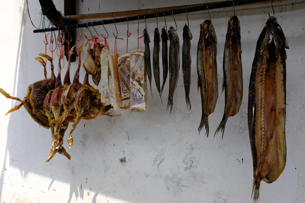 老鄉牆上吊着風乾的雞、魚、肉