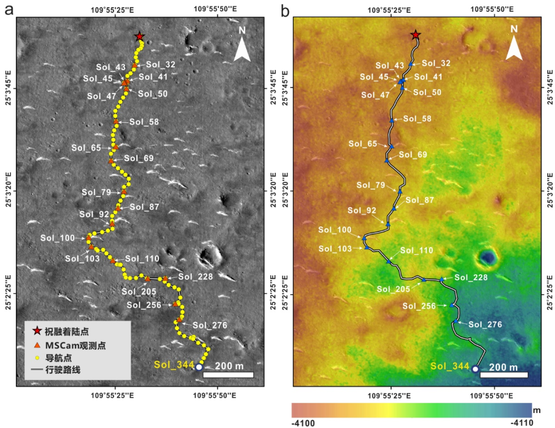 “祝融號”行駛了約1921米,使用不同成像和分析系統對露頭和地表岩石進行詳細的就位觀測。其中,導航和地形相機已獲得106組全景圖像,詳細記錄了“祝融號”行進路線附近許多岩石的表面形態與構造特徵。