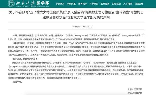 2020年9月,北京大學醫學部發布聲明,接到舉報稱,抖音賬號“五個女博士健康美膚”及天貓店鋪“青顏博士官方旗艦店”以北京大學、北京大學醫學部及相關專家教授的名義為“‘youngdorctor’青顏博士膠原蛋白肽飲品”等產品進行宣傳。“經我部查明,該舉報所涉及的五名人員均為我部往屆畢業的博士研究生(其中二人疑似更名),上述人員行為屬其個人行為,與北京大學、北京大學醫學部及相關專家教授無任何關係。”