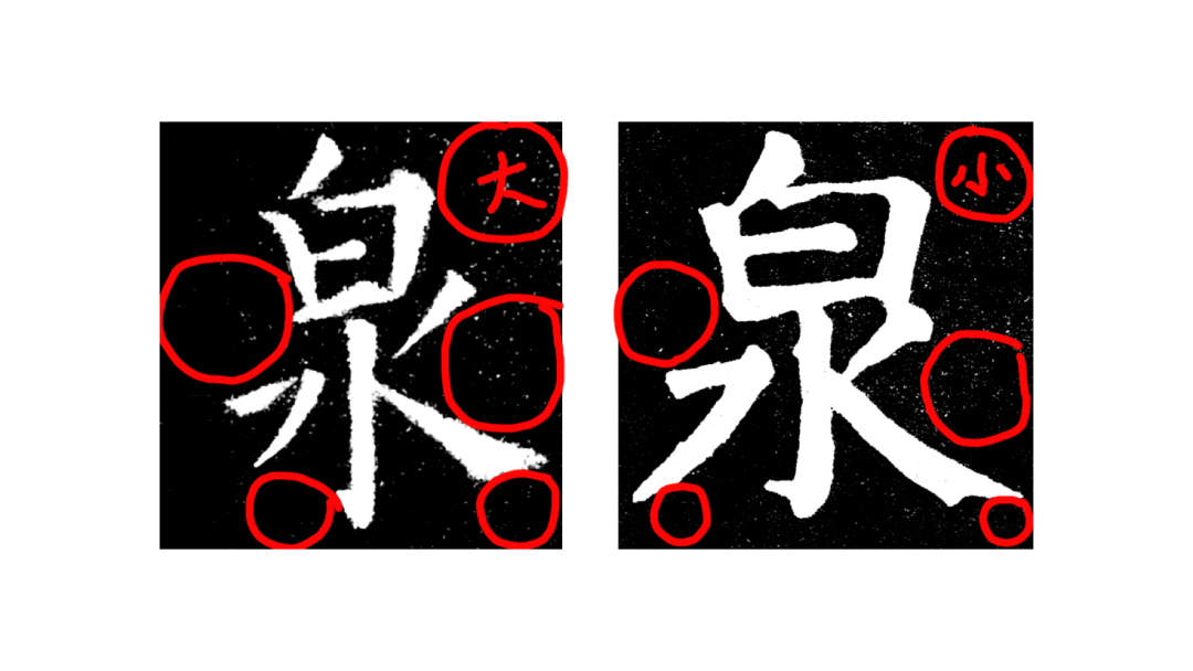 而且還有一點,尤其是楷體中宮緊,什麼是中宮?同樣都是兩個泉字,周圍的空白越大,這個字中宮就越小,周圍的空白越小,這個字中宮就越大,也就是中宮大的字寬綽,顏真卿的字就是中宮大,歐陽詢的字就是中宮小。而宋體橫畫太細,邊角帶着鋭角,它讓字的閲讀感受不如黑體字。也就是説當時沒有更適合屏顯的楷體和宋體,黑體相對適應,就進入到了我們的手機裏。