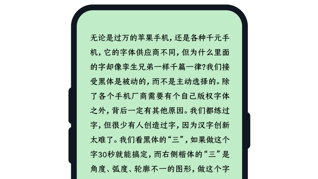 這種黑體在我們手機裏面霸屏了,但是這種字體真正能體現出中國漢字的美學神韻嗎?到底什麼樣的字體,能讓我們在手機上看得更舒服?