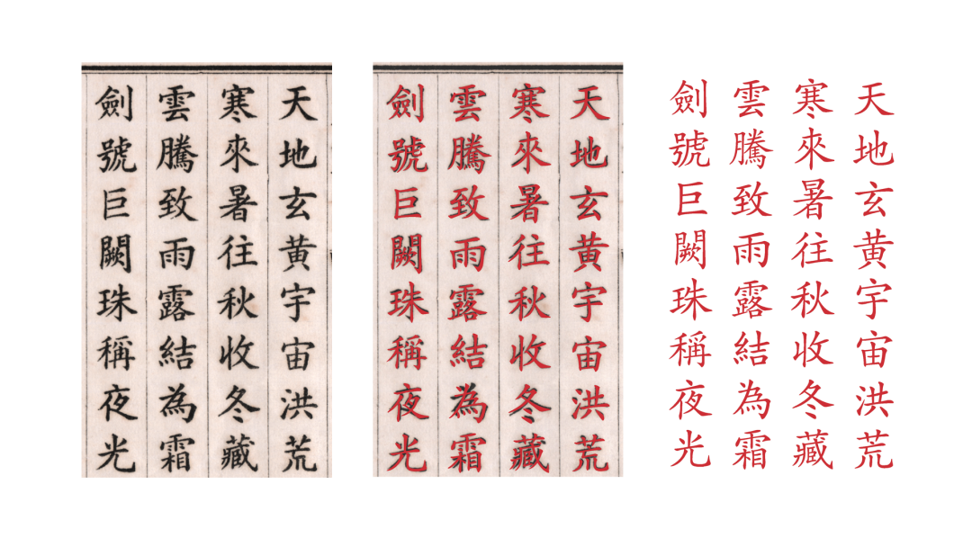 大家看右側是我們現在電腦裏用的楷體,左側是1933年的漢文正楷,然後把這兩個楷體摞在一起的時候,大家發現了什麼?也就是説我們電腦裏的楷體是數字化上世紀六十年代簡體的鉛字。六十年代的簡體鉛字,是模仿的1933年的漢文正楷,而數字化的字體比起鉛字丟失了漲墨的因素,所以大家看紅字摞在黑字上的時候,是不是邊緣還留着黑。它們其實是一樣的字體,只不過人家在設計鉛字的時候,考慮到油墨要有漲墨的因素,所以這種字體直接到了手機裏邊,它就會有問題,它會顯得稀鬆和細,尤其是像到了我這個年齡,甚至更大年齡,眼睛花了之後,他看到的時候更會吃力。