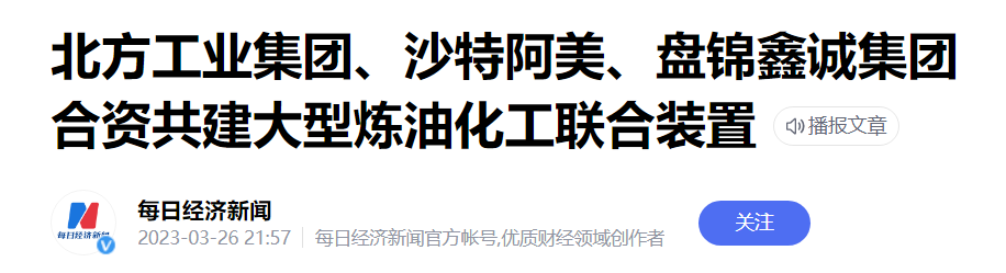 然後又與另外兩家中國企業在遼寧省盤錦市設立的合資公司,將耗資122億美元在中國東北建設日產30萬桶的大型煉油化工聯合裝置。