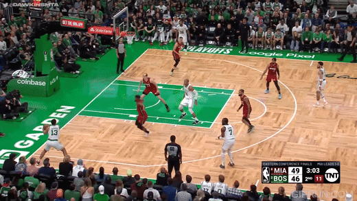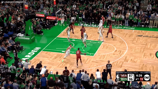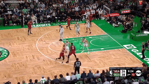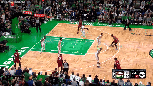 熱第二節拿走了塔圖姆的弧頂持球,第三節削弱了凱爾特人的擋拆,第四節凱爾特人沒法提速,只剩強投三分,以及雙傑在上線站着輪流持球打了——還得虧格威有個底線內切扣籃,算凱爾特人第四節罕見的無球跑動。