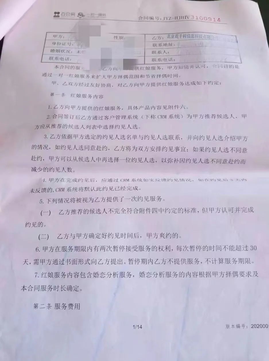 陳女士稱,她後來發現所謂的“面試”很容易就能通過。籤合同前,她曾問,“若結不了婚,錢怎麼辦?”一位李姓工作人員答覆説“肯定能結婚”。考慮到若結婚還能返還70%費用,她便籤下了這份服務合同並繳費。