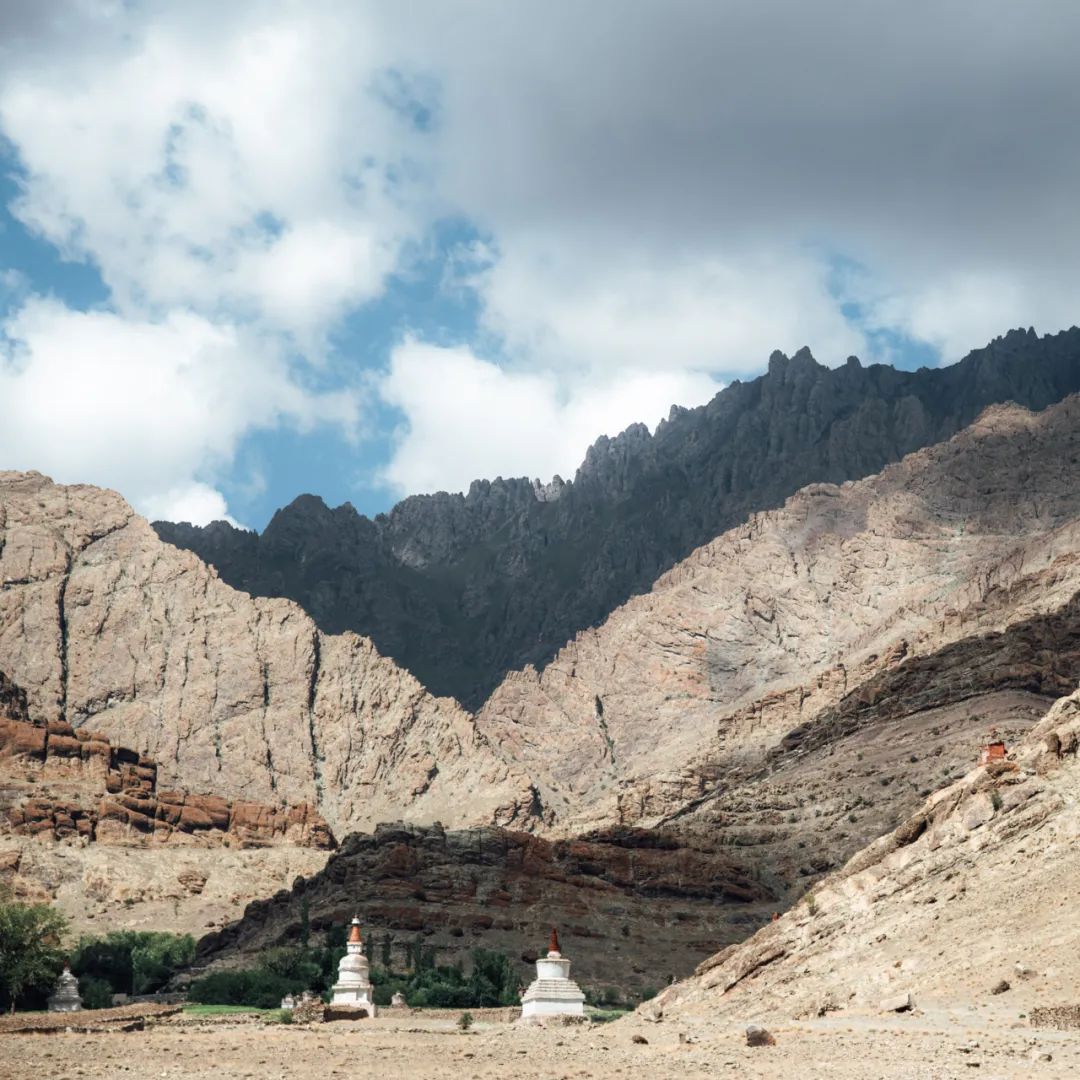 黑米寺地處獅泉河左岸一處十分貧瘠的山谷中,這裏的地貌正是我之前寫馬列公路時提到過的被地質力量翻轉90度的頁岩峽谷。斯托克山脈的冰川融水滋養了斯托克和瑪妥這兩個村莊,流經黑米寺的僅有一條小溪流。匱乏的水源並不足以支撐起大面積的農業灌溉,山勢的陡峭也讓這裏看起來更像修行場所而非宜居之地——就像藏區很多寺廟一樣,黑米寺顯然也是由閉關修行的山洞發展而來的。