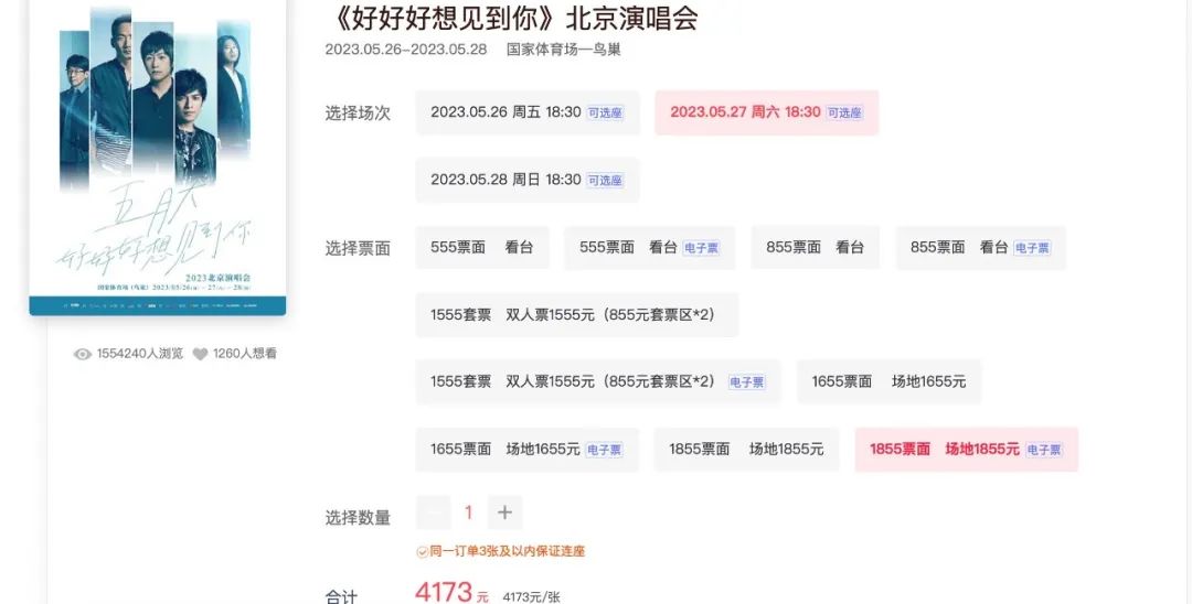 首先,開5萬人以上大場的演唱會歌手不多。周杰倫、五月天是開大場歌手中,票價溢價最高的。票牛、摩天輪上五月天的北京6場演唱會,最高溢價超過了2000元,1855元的票面價賣到了4000多。不止北京演唱會,五月天在深圳的3場演唱會溢價也在兩個平台超過1000元。