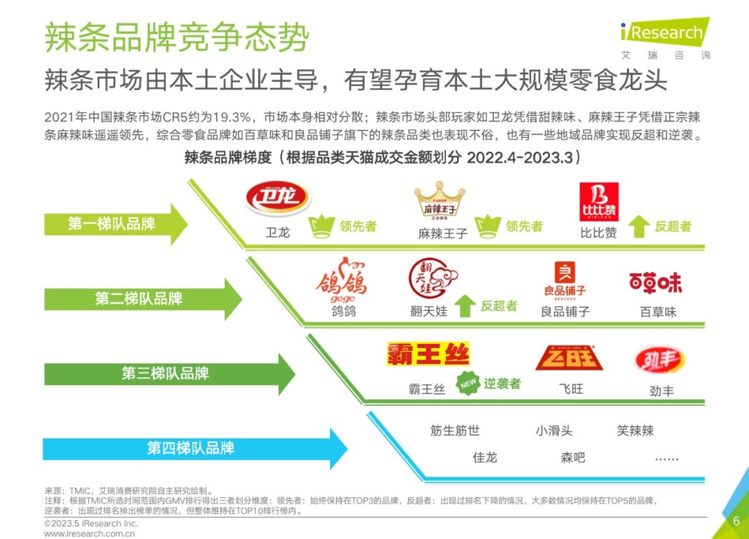 數據顯示,2021年中國辣條市場CR5約為19.3%,市場本身相對分散,辣條市場頭部玩家如衞龍憑藉甜辣味、麻辣王子憑藉正宗麻辣味遙遙領先,綜合零食品牌如百草味和良品鋪子旗下的辣條品類也表現不俗。