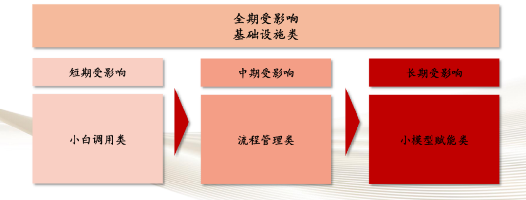 針對第一個論點,華西證券對可能受到GPT影響的公司進行了詳細地分析,將它們分為四類:基礎設施類、小白調用類、流程管理類、小模型賦能類。這些公司在AI技術,特別是GPT的影響下,將面臨不同的挑戰和機遇。