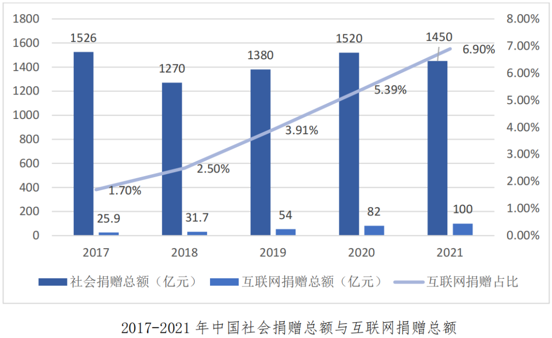 ▲2017-2021年中國社會捐贈數據。圖片來源:《互聯網公益慈善「中國樣本」》報告。
