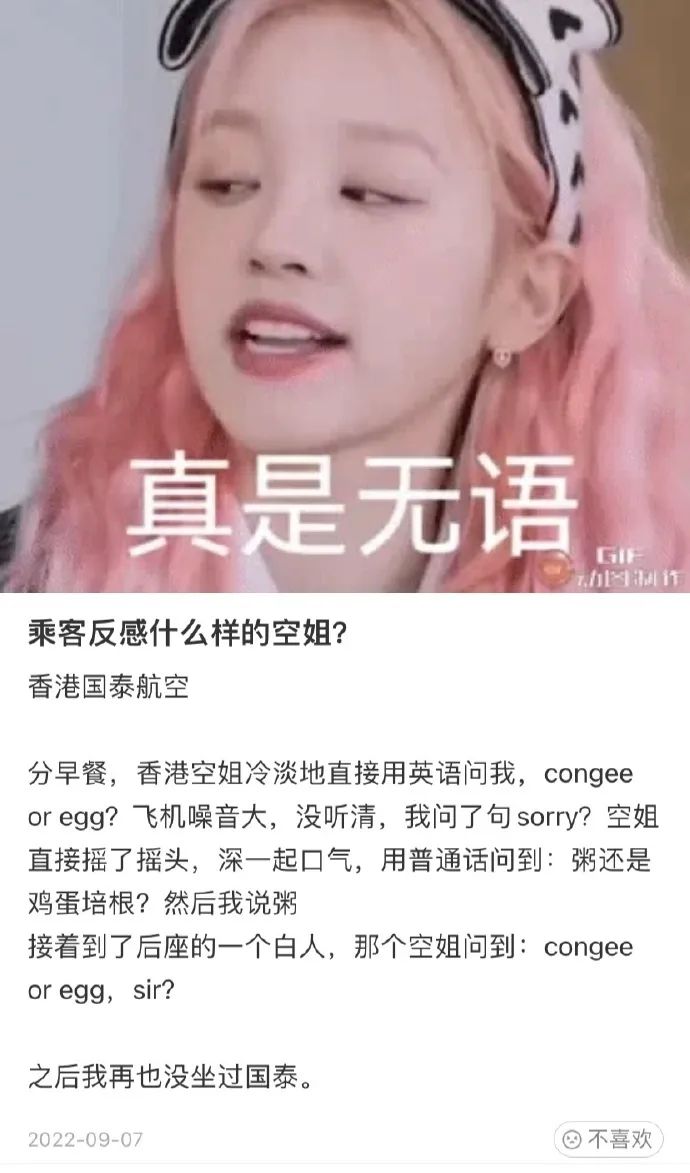 也是沒想到,創辦於1946年的國泰航空,2023年因為空乘的毛毯事件,名字在很多人心裏已經變成了這樣: