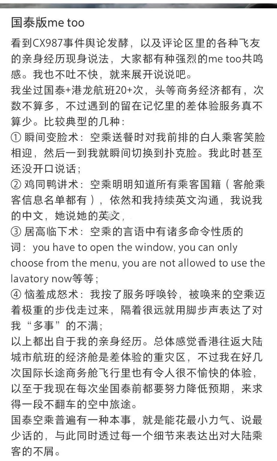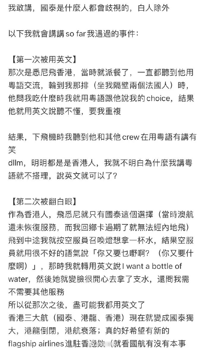 而且措辭和語氣寫的像第一次歧視被抓包,明明很多旅客都遭受過國泰的差別對待。