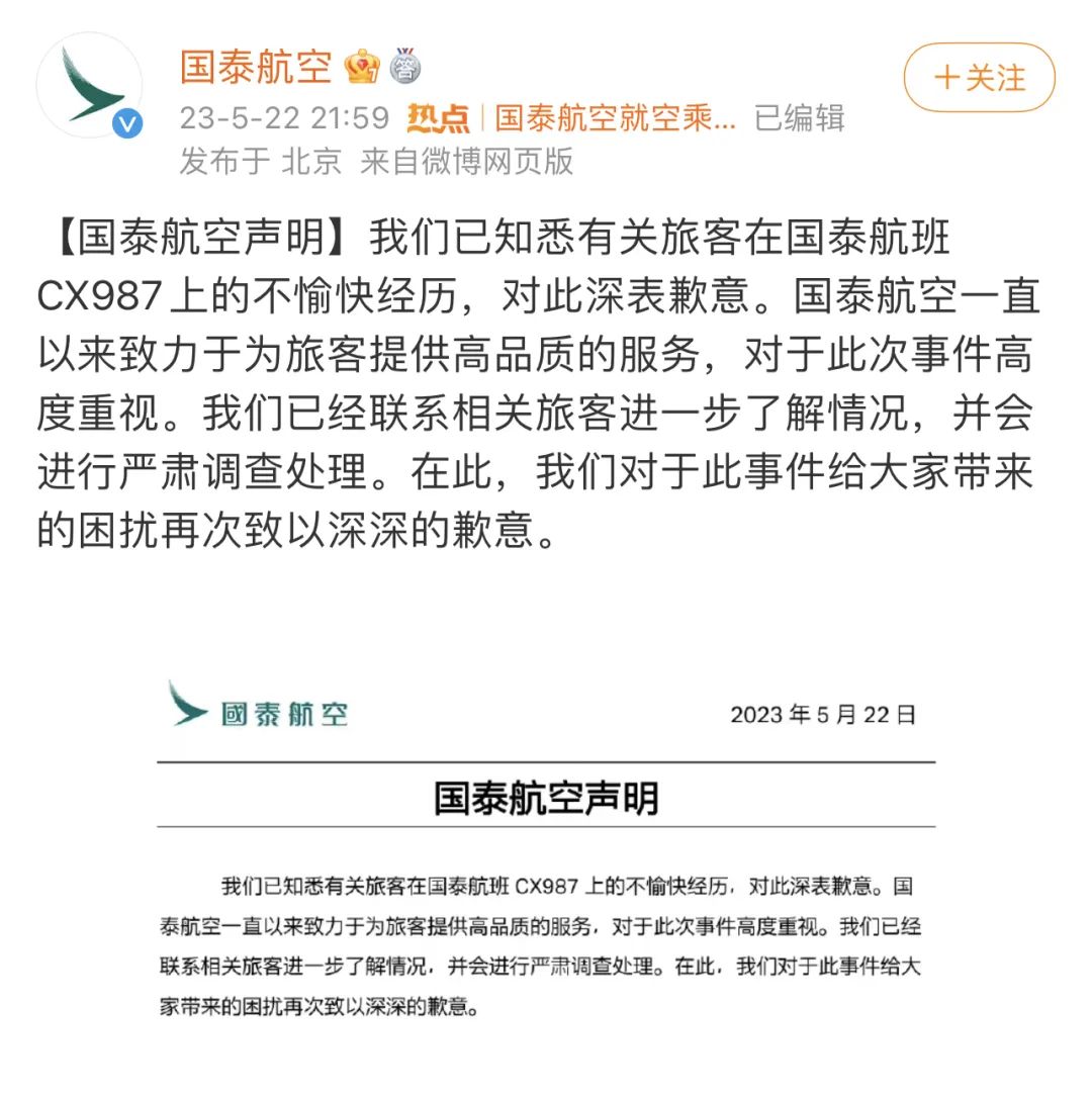 5月22日晚間,國泰航空在原帖評論區以及官方微博發佈聲明致歉。
