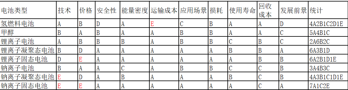 1、 從表格分析綜合性能比較好的是,鋰離子凝聚態電池 、甲醇燃料電池 、鋰離子固態電池