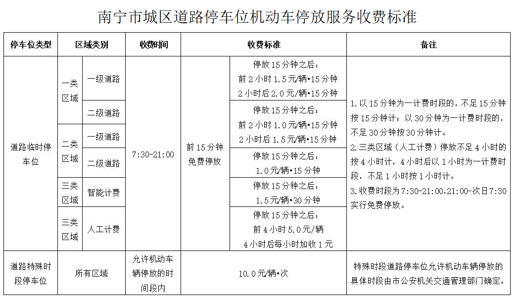 根據收費標準,收費時段為7:30-21:00,其餘時段免費開放。按照階梯進行計時收費,前15分鐘免費,之後按照不同的區域級別實行不同的收費標準,折算後每小時3-8元不等。因此,如果在南寧市一類區域一級道路臨時停車位停車一天,需要繳納102元的停車費。