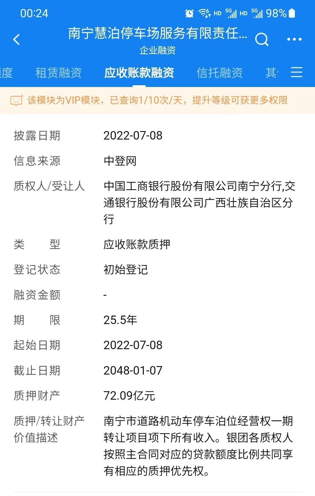 本來以為這個有點奇葩了,更奇葩的東西出現了。根據很多資深網友的深挖,慧泊停車居然把自己收費經營權質押給銀行了,抵押經營權時限為25.5年,經營權評估為72億,真的不能小看路邊停車這樣的小生意,72億融資就到手了!
