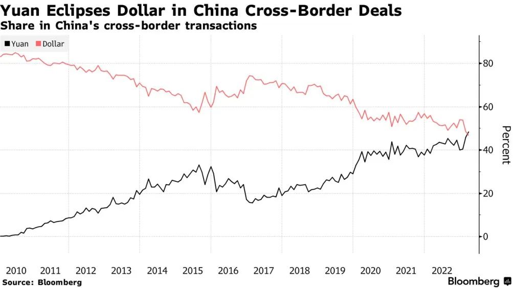 今年3月,人民幣在中國的跨境結算佔比首次超過了美元。