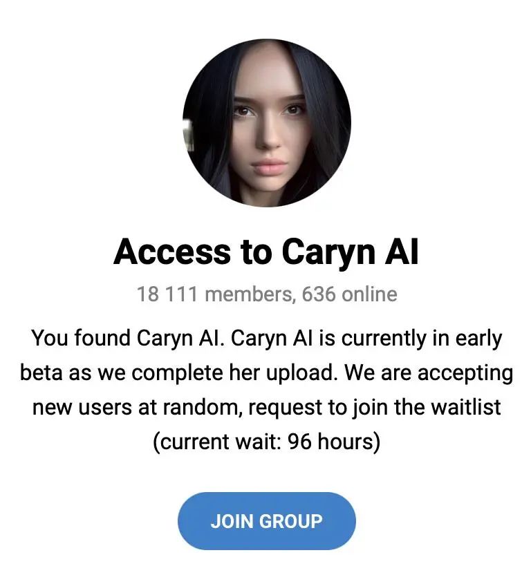 目前打開 Caryn AI 的 Telegram 羣組,已經超過 1.8 萬人在組裏,接入聊天需要等待 96 小時。
