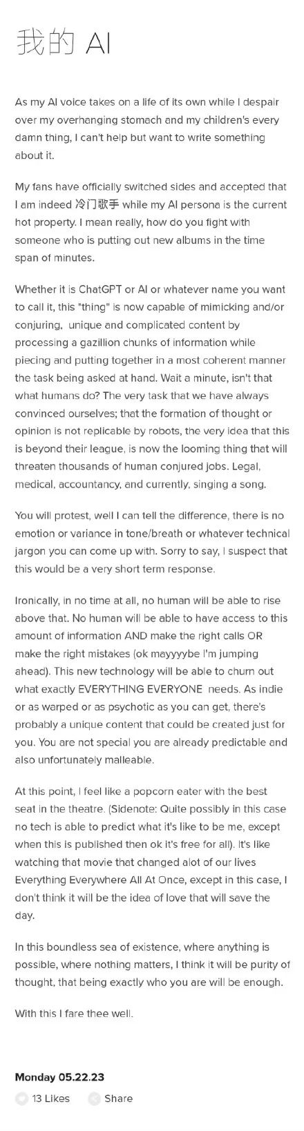 回顧孫燕姿出道20多年,更覺得這次回應AI孫燕姿的態度,真的非常孫燕姿,堪稱拿得出手的第一篇公眾人物對人類Ai新時代的宣言: