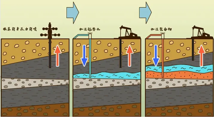 這就完了嗎?當然沒有。1950年後,石油技術人員發現用聚合物、表面活性劑、聚合物交聯劑等特殊化學物質降低油藏內水的表面張力和粘度後,還能再抽出一部分油,於是就有了三次採油技術,也被稱為化學驅油法。之後又陸續出現了蒸汽吞吐採油法、微生物驅油法等三次採油技術。